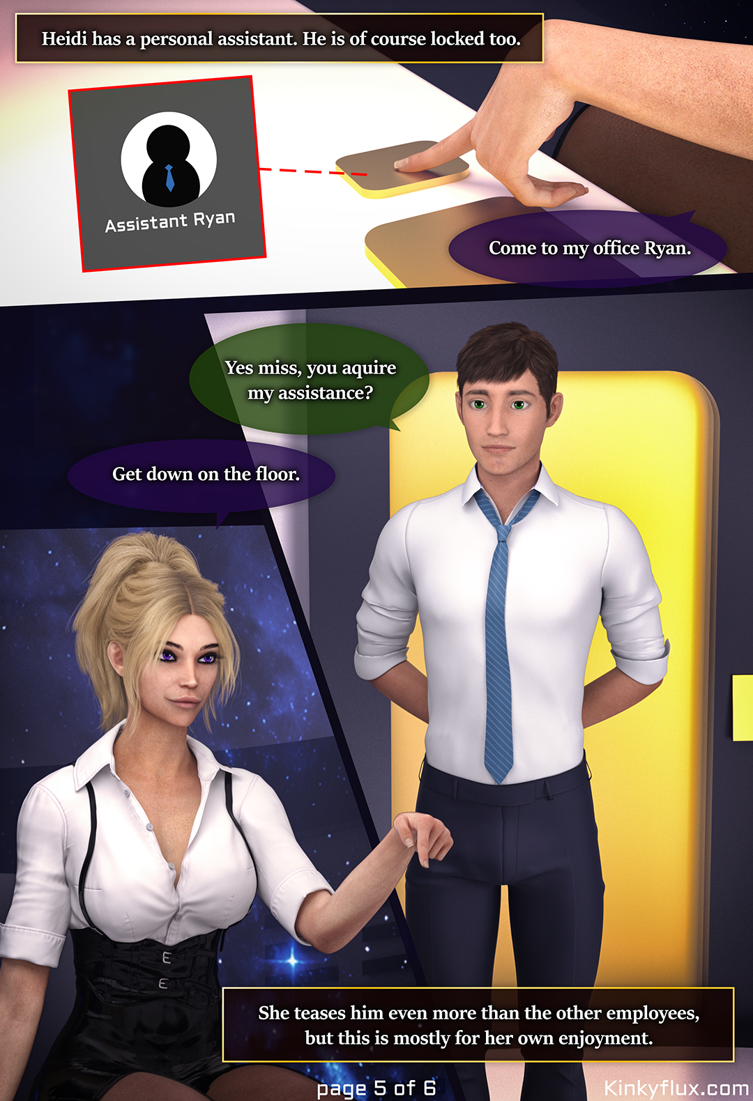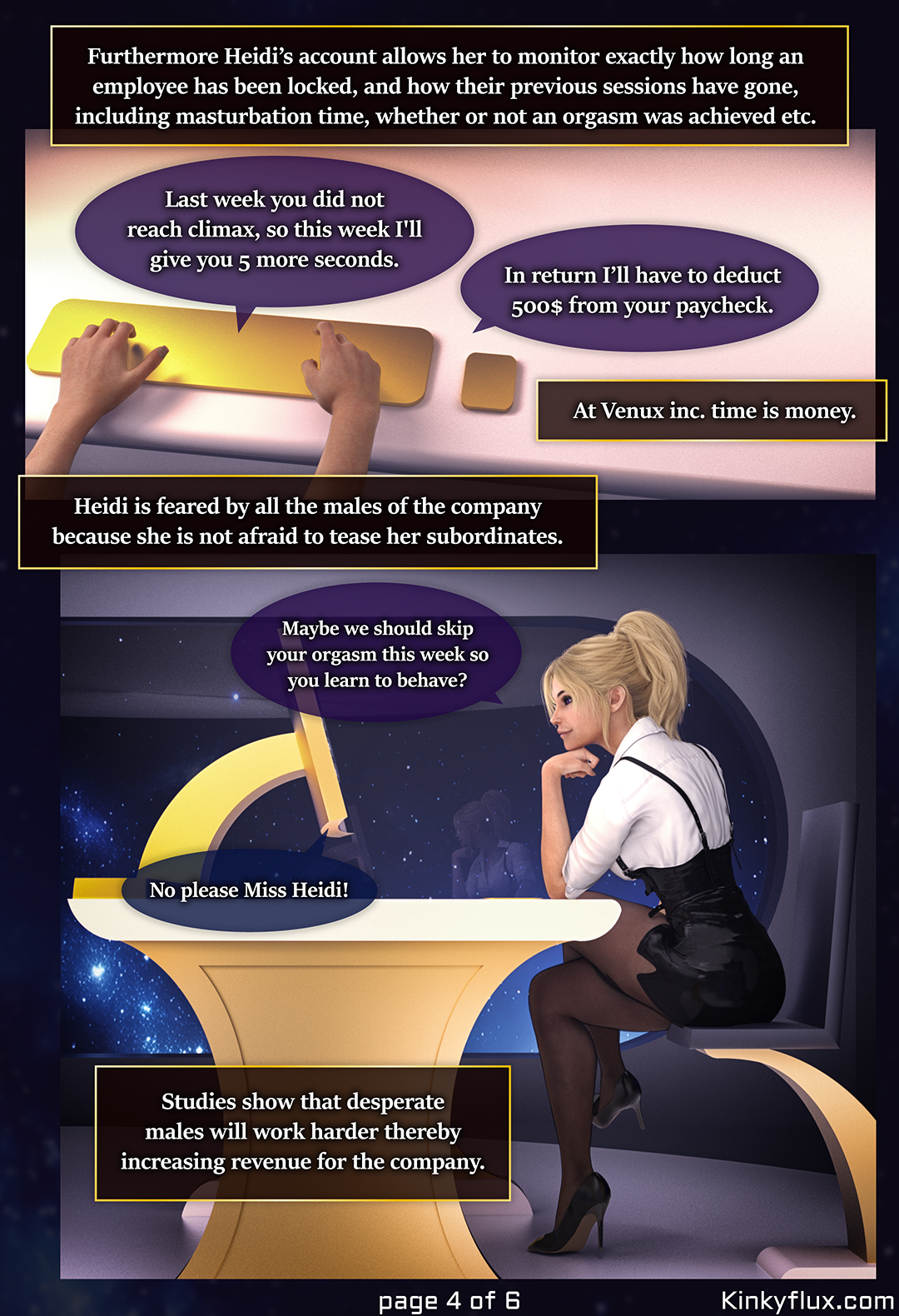 At Venux inc. every male is required to wear a chastity device and Heidi, the chastity manager, controls every one of them.